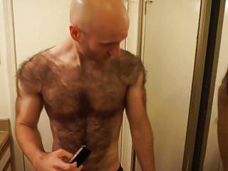 Sehr haariger Mann rasiert seine Brust und einen Rücken – Heute wird enthaart